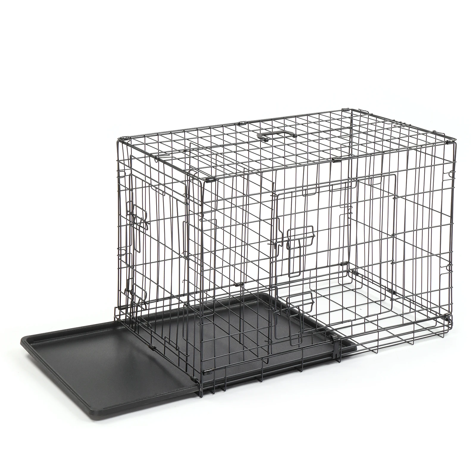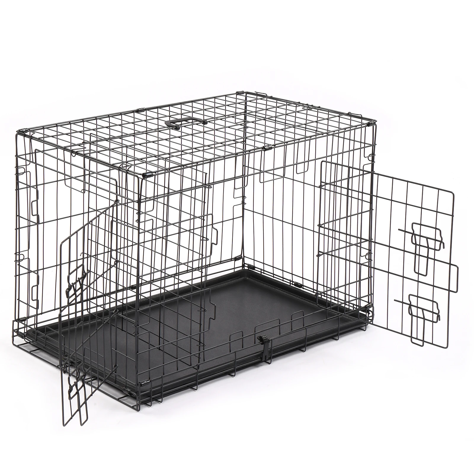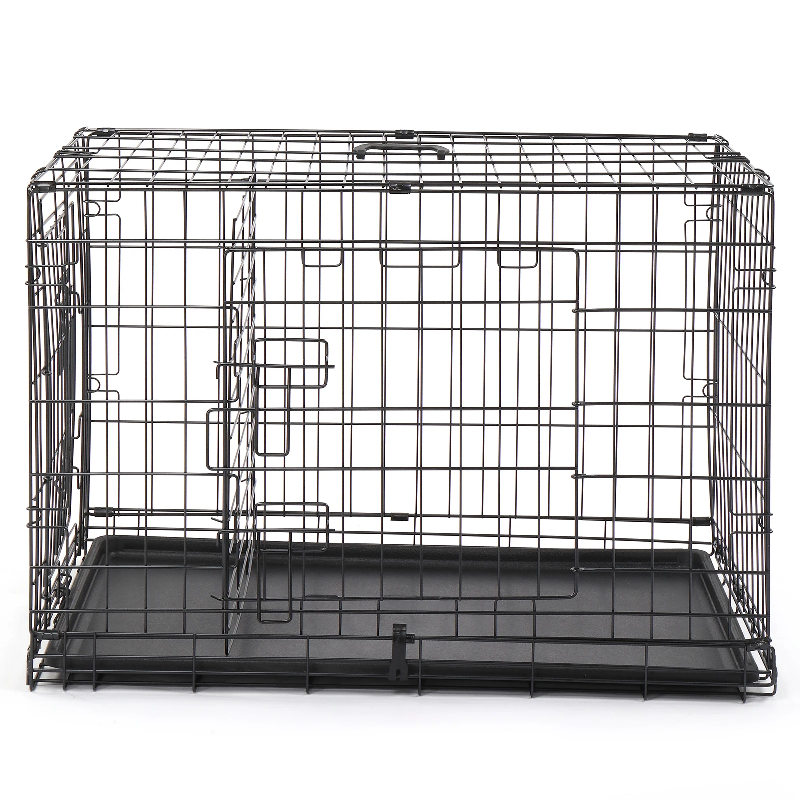 Have you ever noticed your dog always sleeps and relaxes under a table or in a corner? This Pet Cage is the perfect solution to make your pet feel more secure and confident. These premium quality metal pet crates are crafted using commercial-quality materials and superior manufacturing. The crates feature multiple doors that lock easily with a slide-bolt latch, with a durable black electro-coat finish. To set-up, simply unbox and fold open; no tools are required. Each crate features a lightweight, slide-out tray made of durable ABS plastic. Features:
