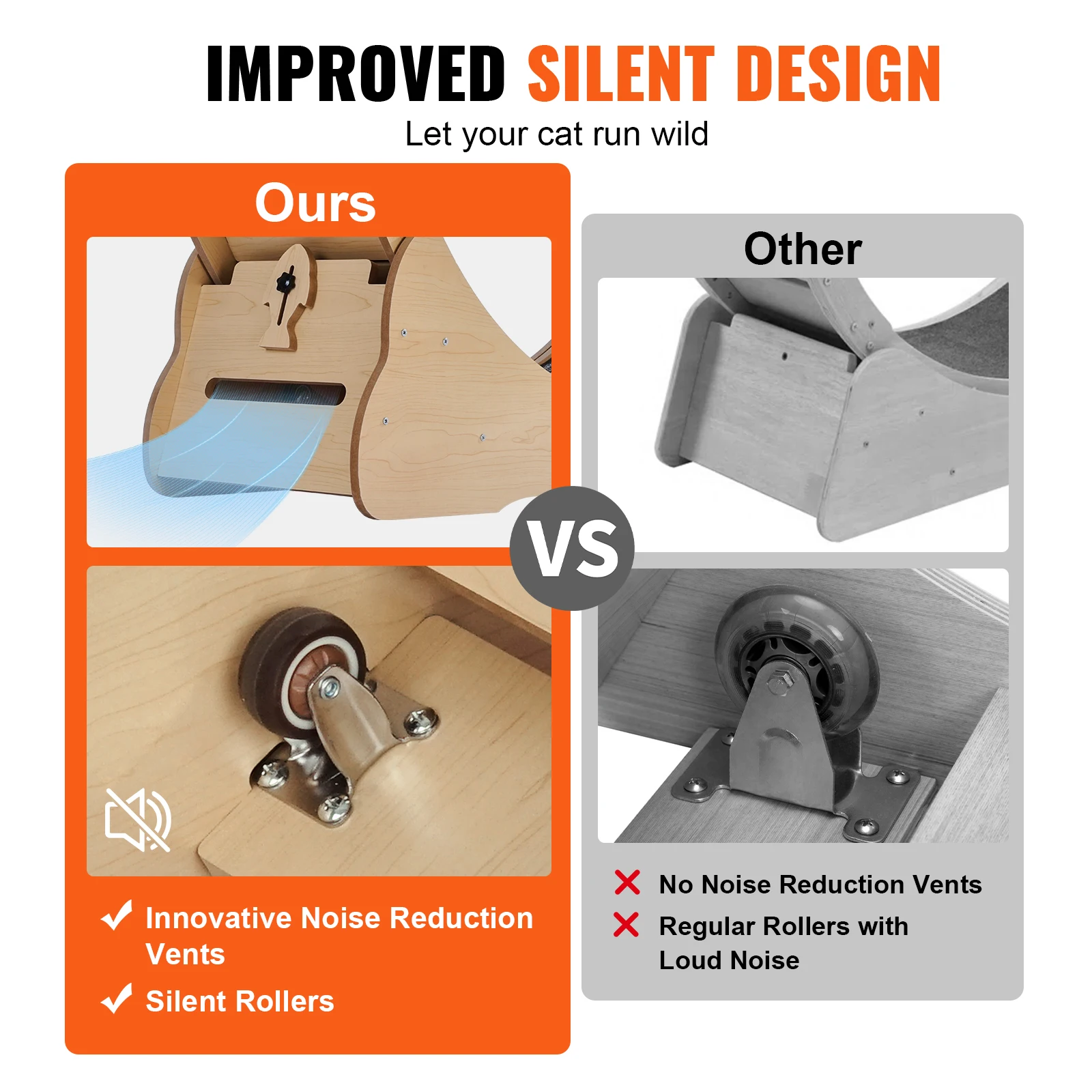Comfort and Safe Cat Exercise Wheel This cat exercise wheel is crafted from solid wood, ensuring its durability. With a spacious 13.31-inch wide base, it provides your cat a stable area to exercise. The unique 0.2″/6 mm gap design ensures safety, allowing your feline companion to run freely on the wheel. Featuring a silent wheel and noise-reducing holes, our cat wheel can reduce noise by 10-20%, creating a peaceful and enjoyable exercise environment for your pet. This allows you to coexist harmoniously with your pet and family. The spacious inner diameter provides your furry cat with ample room for free and comfortable movement, suitable for cats of all sizes. Whether big or small, they can all easily use it to run and play. The detachable inner mat makes cleaning a breeze. You can easily remove and clean or replace the inner mat. Pre-installed cat running wheel and expansion screws make installation simpler and more secure, providing you with added convenience. This isn’t just a cat exercise wheel; it’s also a cozy cat bed. You can place soft cushions, blankets, or mattresses on the wheel, making it a comfortable cat home. Features & Details Durable and Safe Design: Crafted from sturdy wooden panels with a thickness of 0.5″/12 mm, this cat exercise wheel features a narrow 0.2″ gap to protect your pet’s paws. The widened base and running surface provide enhanced stability. It promotes feline health by reducing obesity risks and improving joint mobility, keeping your cat active and happy Quiet and Comfortable Environment: Featuring a built-in silent wheel and a bottom noise-reduction mechanism, this dual-layer noise reduction system ensures a peaceful and enjoyable exercise experience for your pets, while enhancing the overall indoor ambiance Ideal for Cats of Various Sizes: Featuring an external diameter of 43.3 inches (1100 mm) and an internal diameter of 39.37 inches (1000 mm), this cat exercise wheel is designed to suit cats of different sizes, with a weight capacity of up to 25 lbs. It provides ample space for your feline companions to move, stretch, and expend their energy comfortably Convenient Setup: Features pre-installed expansion screws and a wheel for quick and hassle-free assembly, helping you save time. Comes with useful extras such as gloves, a screwdriver, and a cat teaser for added practicality. The treadmill is designed for easy maintenance, equipped with a detachable looped mat that resists scratches and can be cleaned effortlessly with a cloth or sponge Multi-Purpose Cat Exercise Wheel: Designed with a locking system for stability, this cat wheel serves as an interactive play area, a cozy resting spot, and a stylish furniture addition. It can be adjusted to a stationary mode, enabling cats to run, spin, climb, or relax. Perfect for keeping your feline friends active, entertained, and comfortable